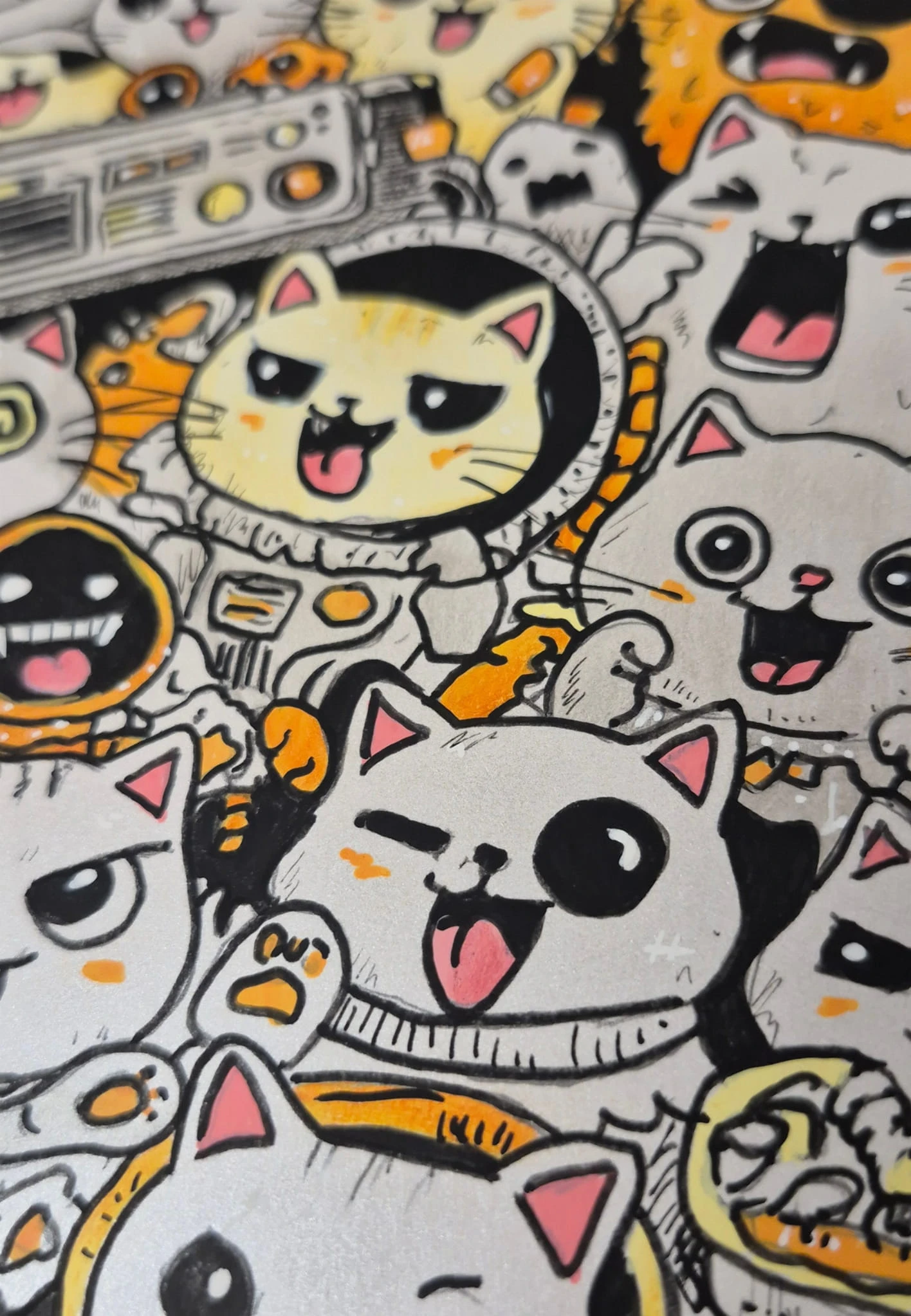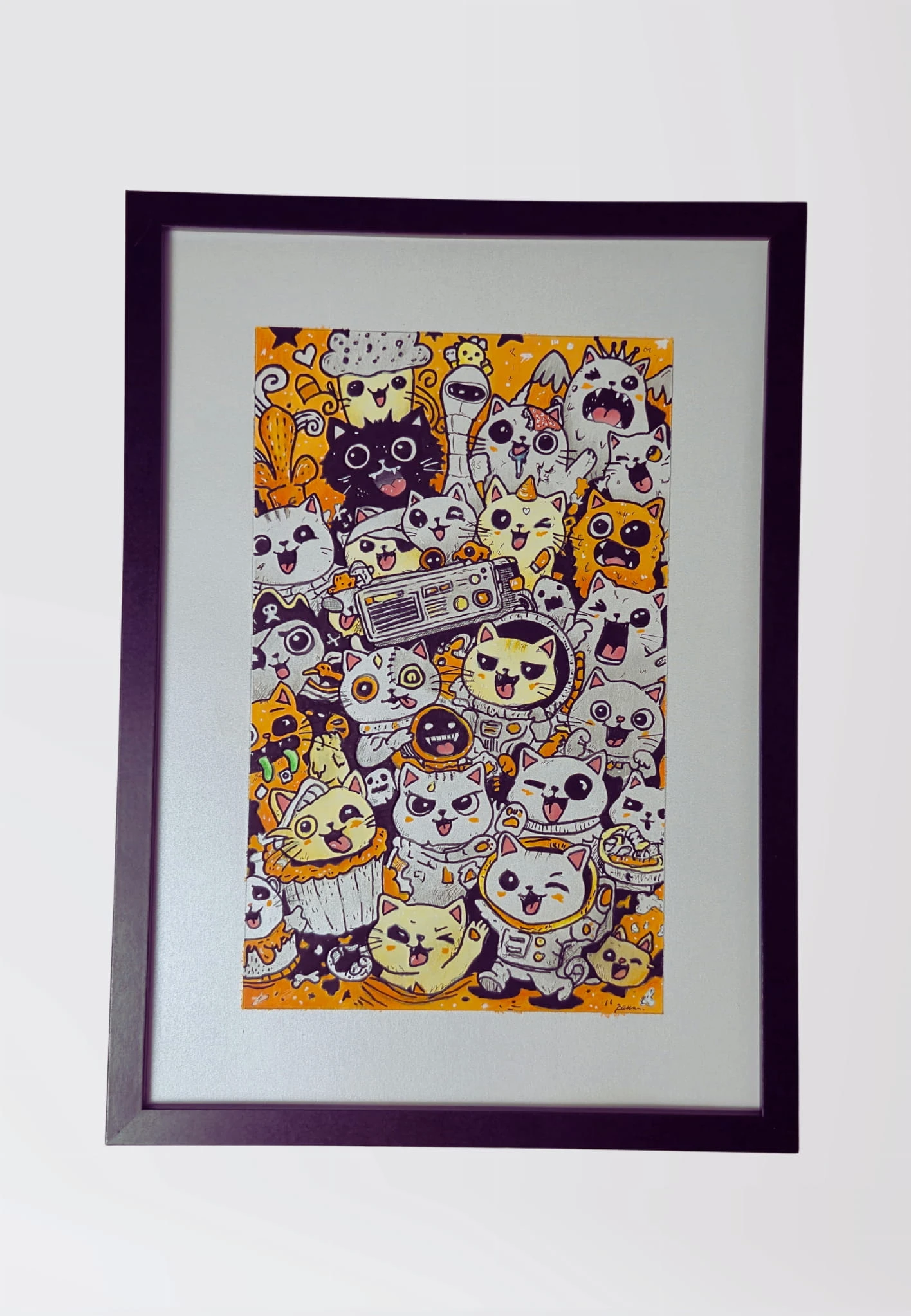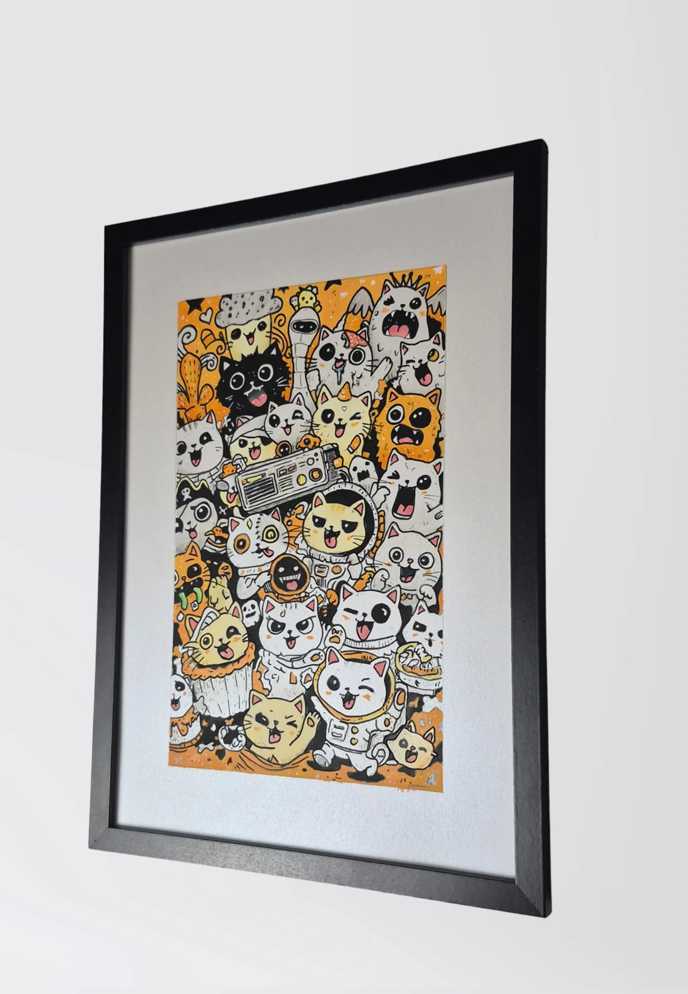 Wyjątkowa, ręcznie wykonana ilustracja przedstawiająca zabawną kompozycję kolorowych kotów, pełną energii, humoru i detali. To oryginalna praca artystyczna, która przyciąga wzrok i nadaje wnętrzu niepowtarzalnego charakteru.