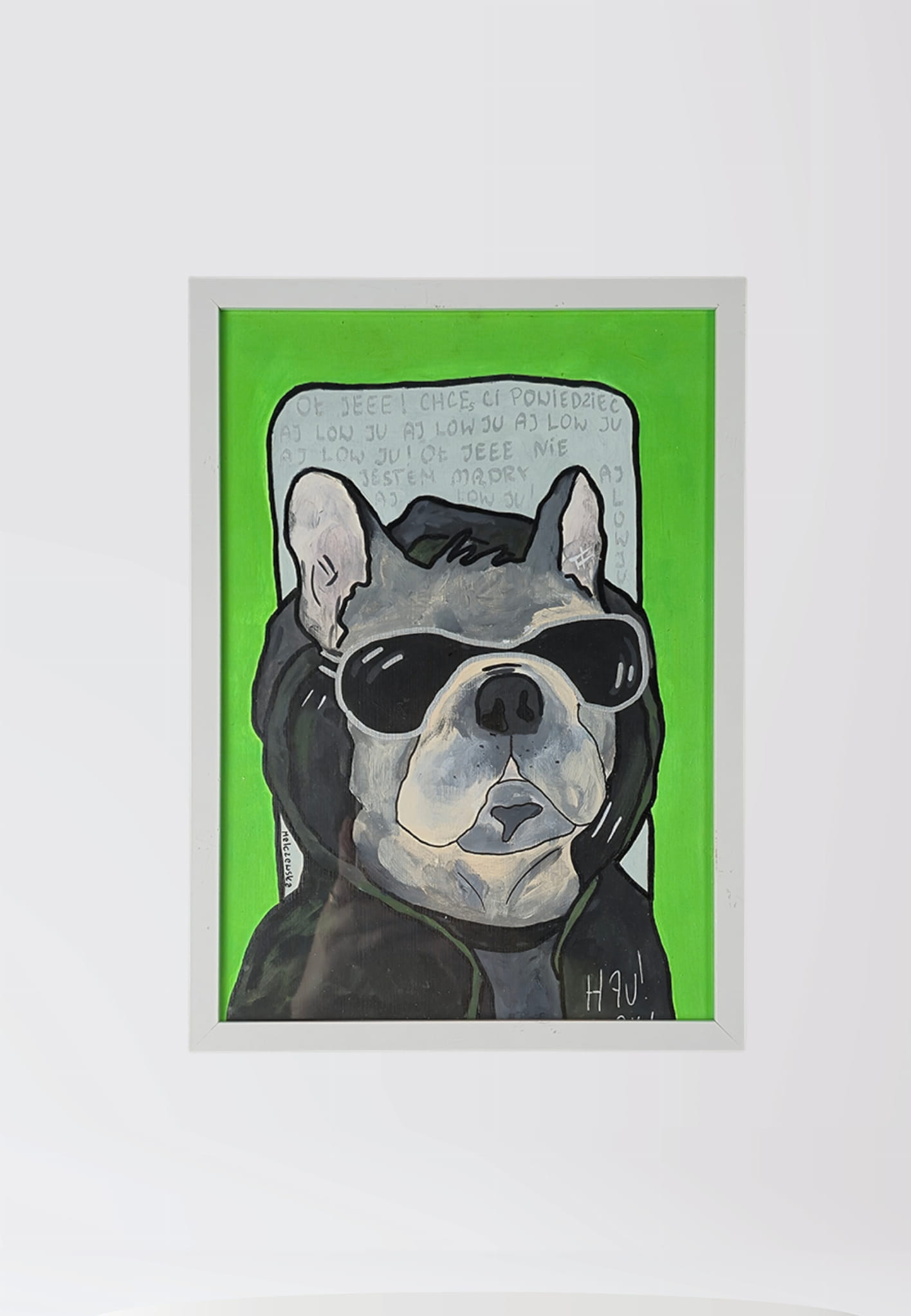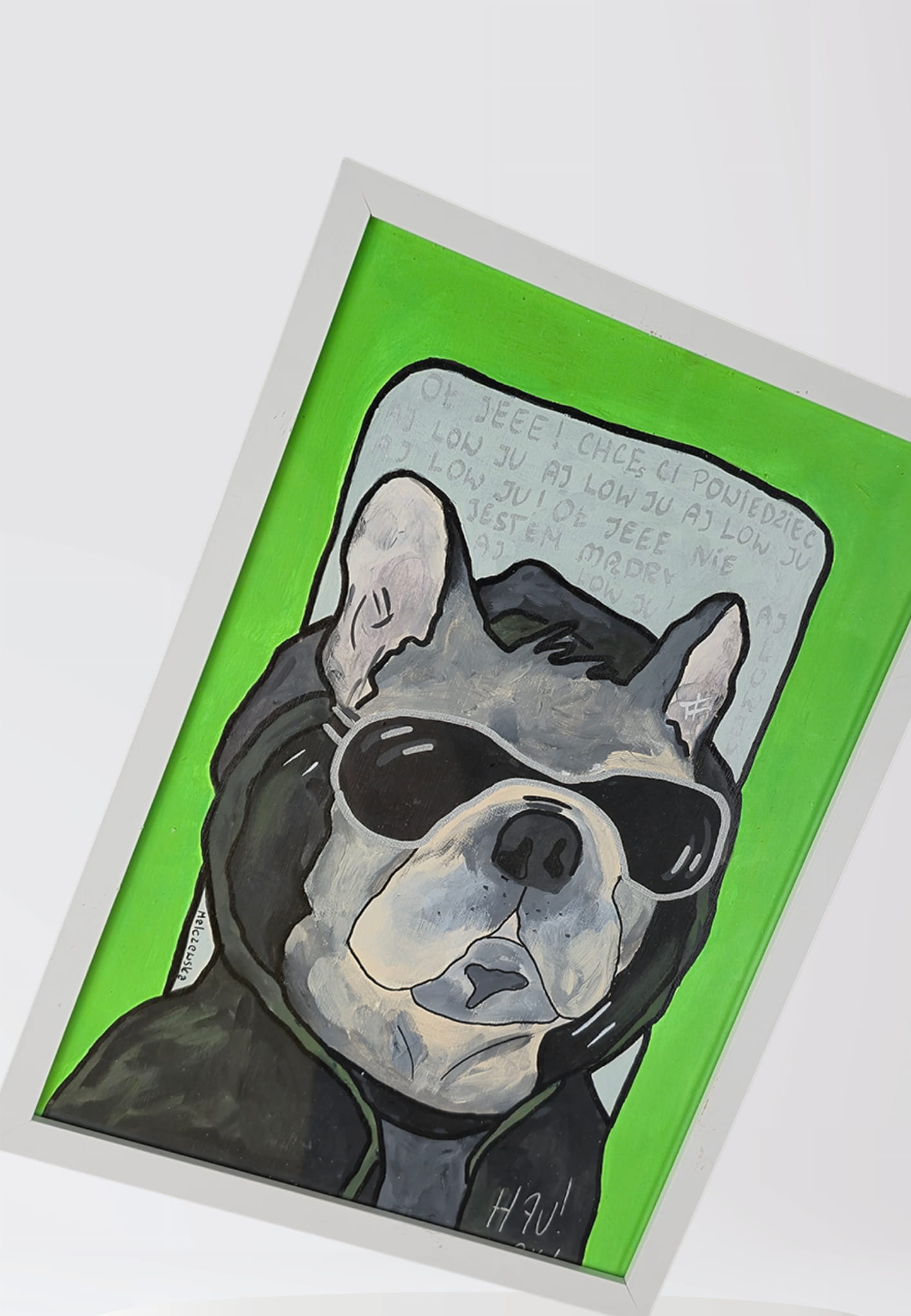 Motyw: buldog francuski inspirowany klimatem polskiego rocka