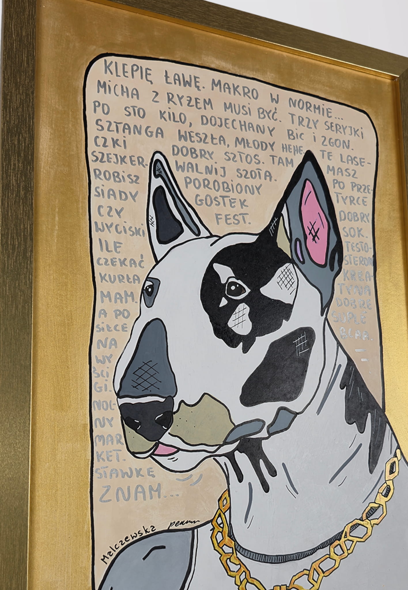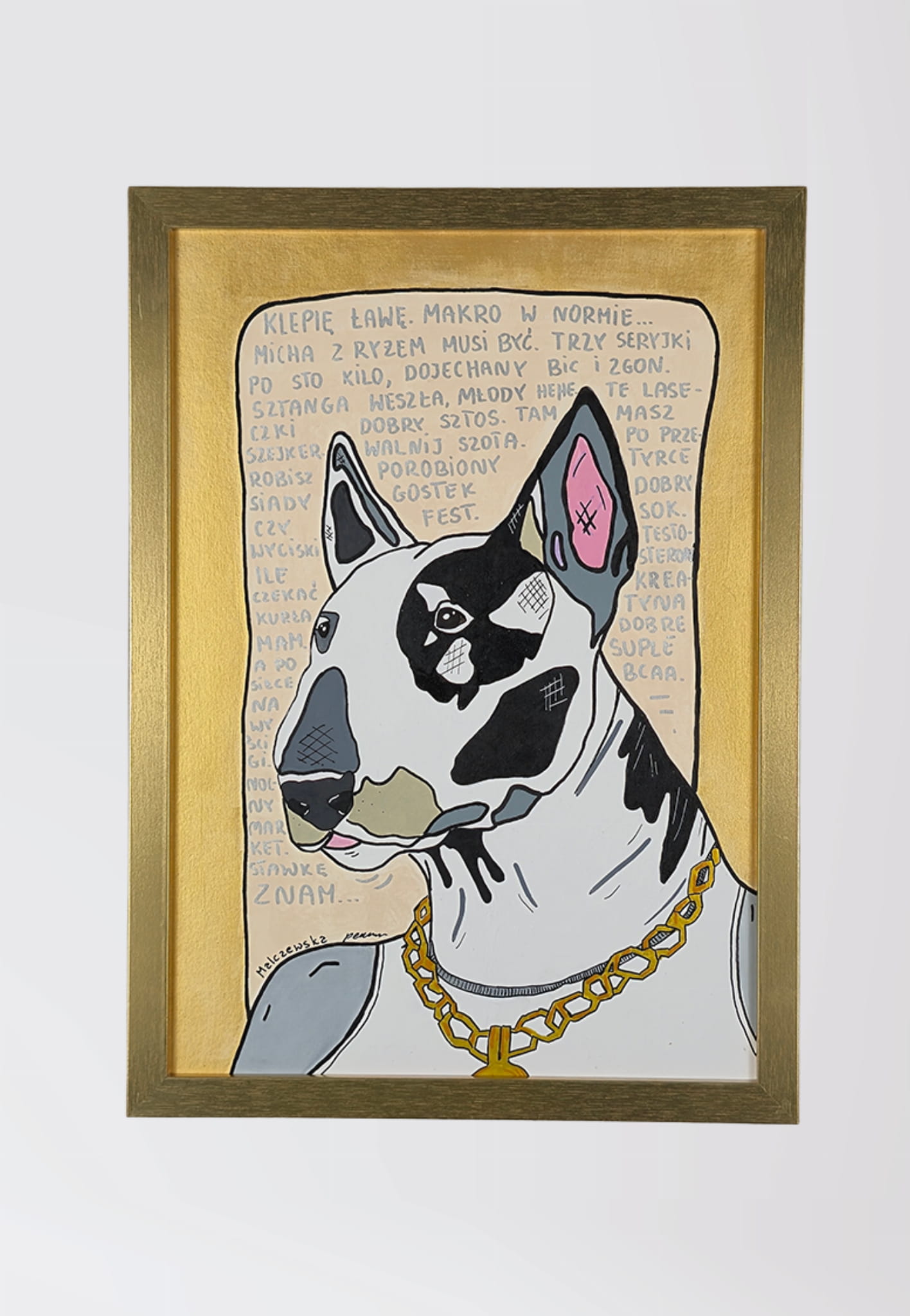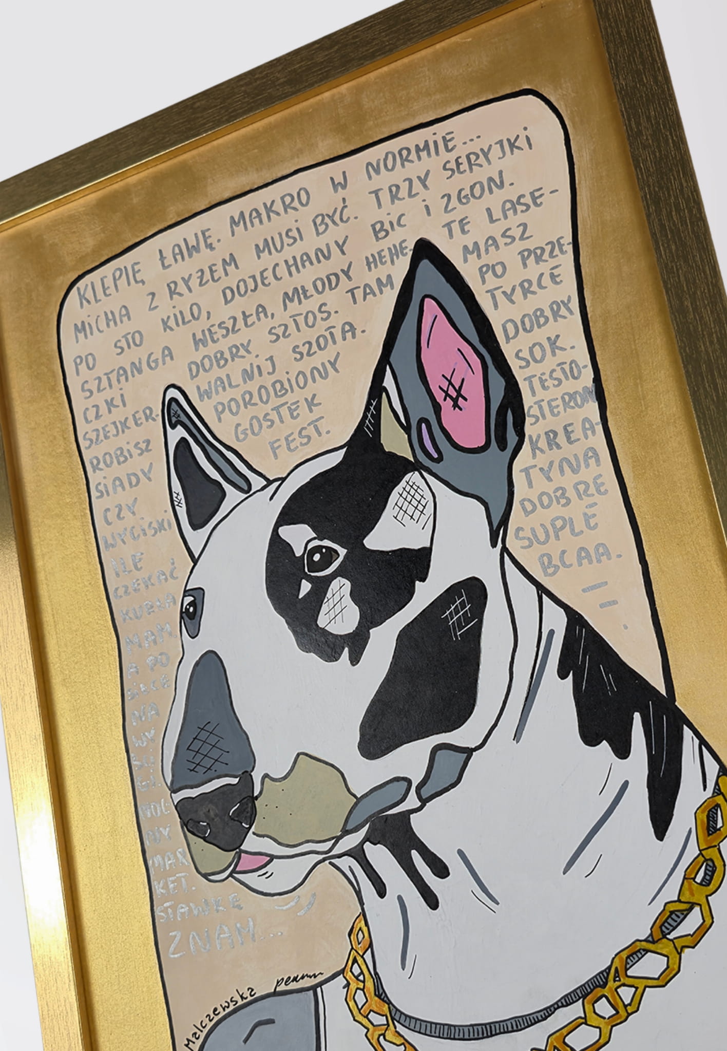 Ręcznie malowana grafika / plakat z motywem psa bulteriera.