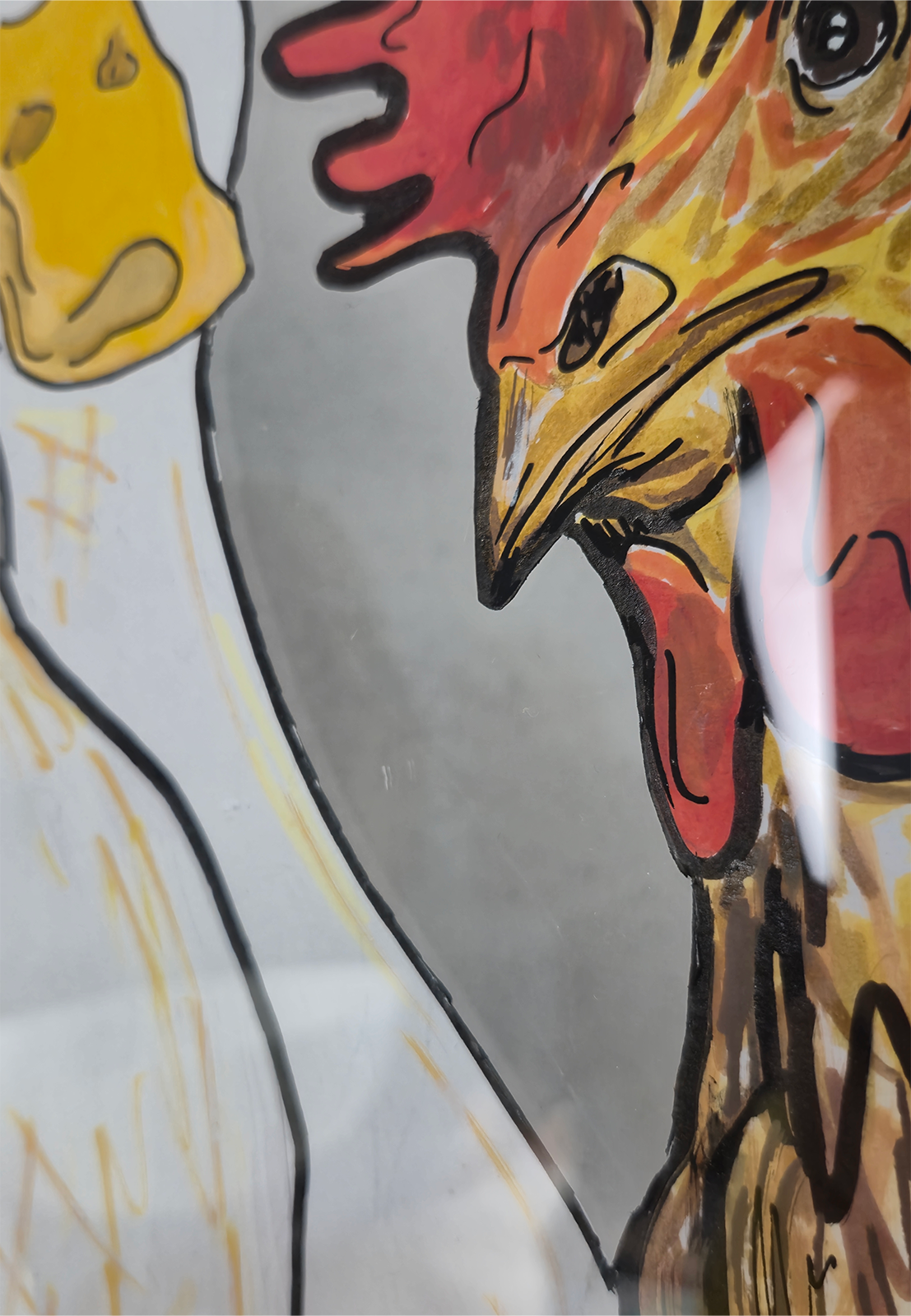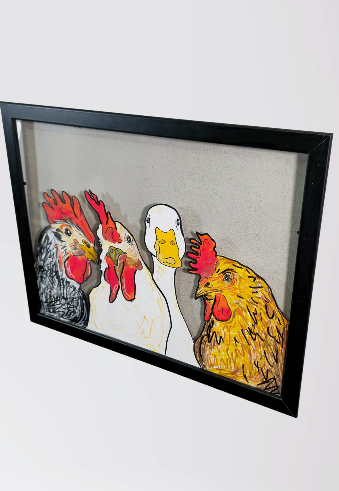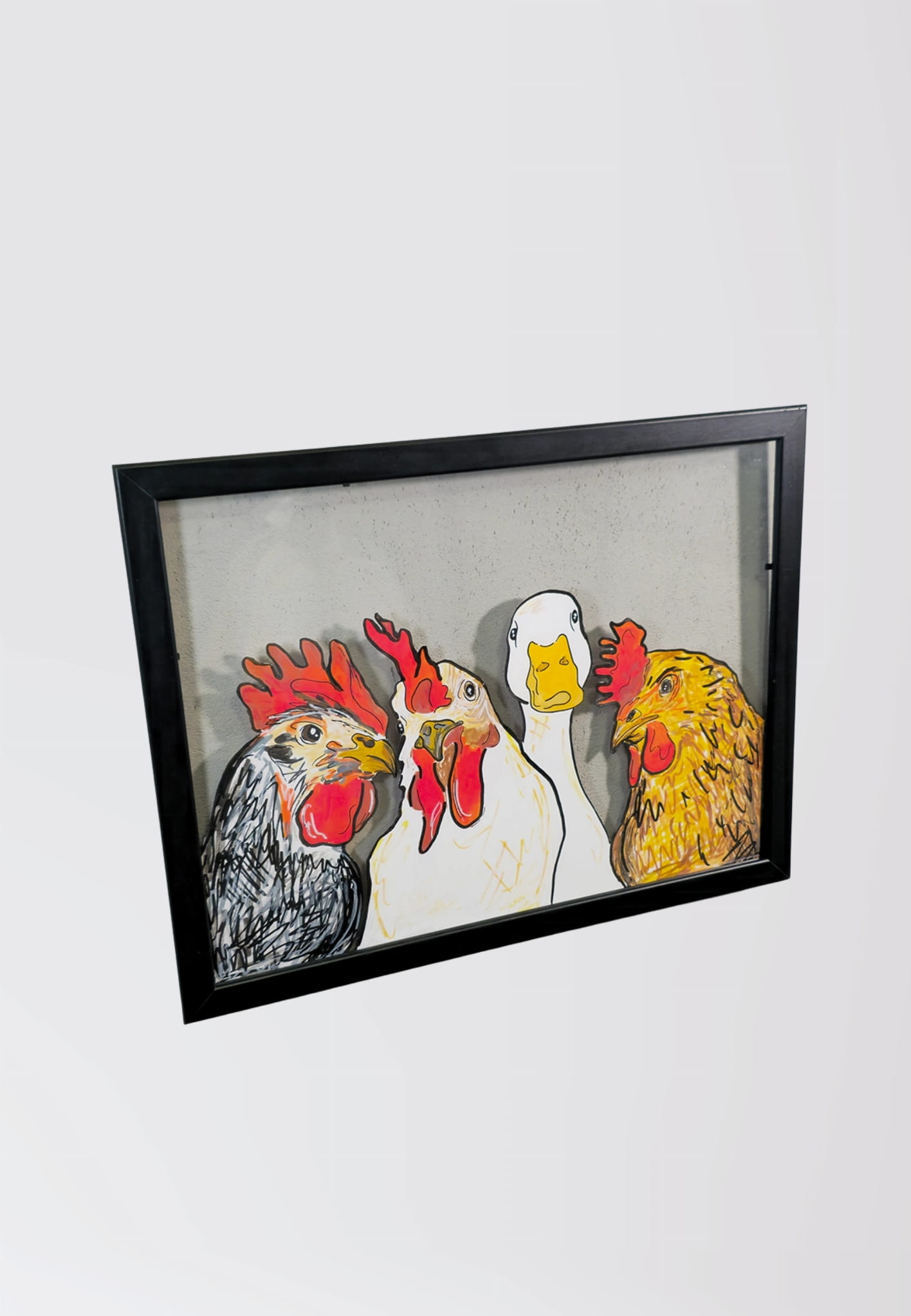 Styl i humor: unikatowa, ręcznie malowana praca z zabawnym motywem wiejskich ptaków
