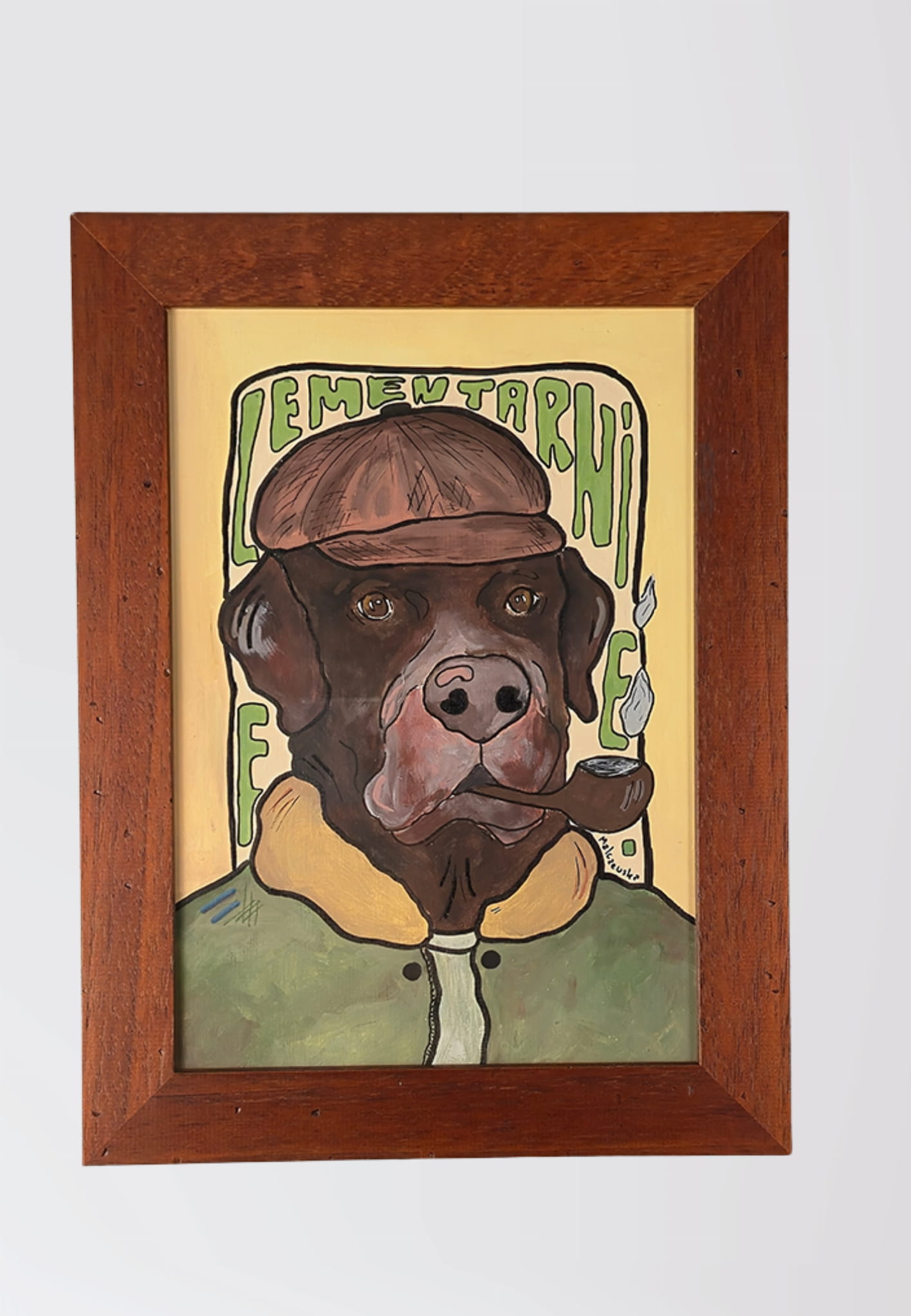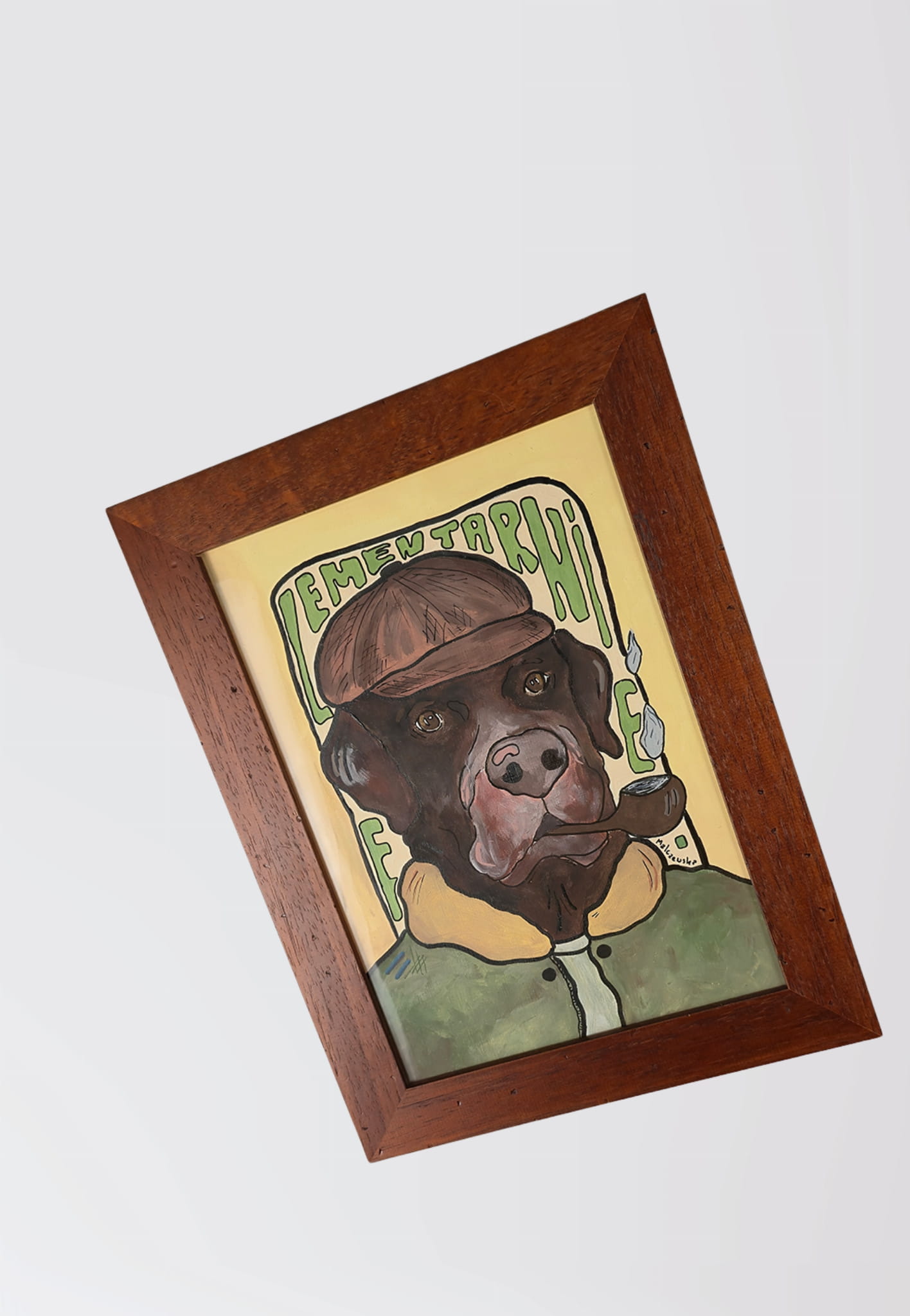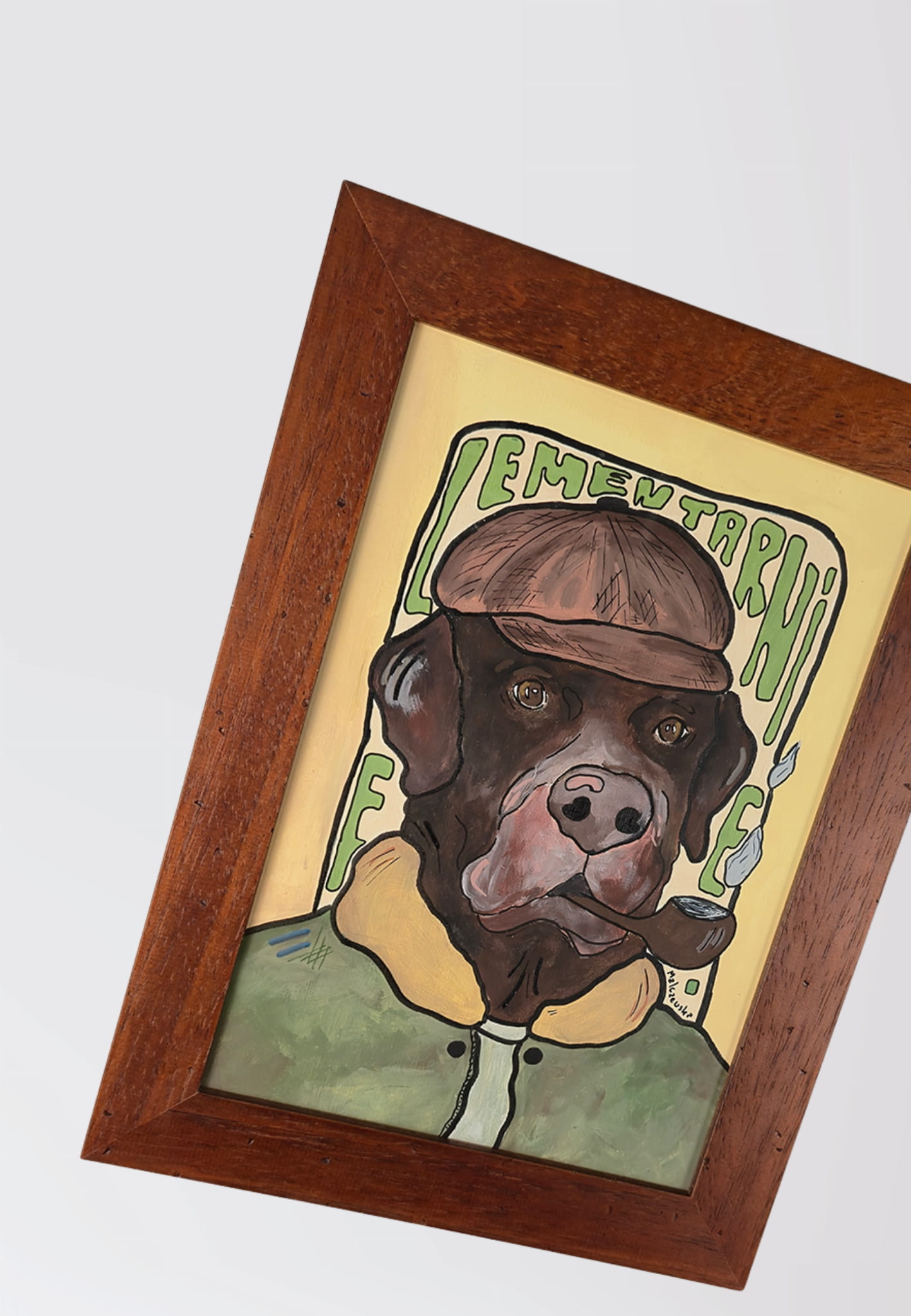 Ręcznie malowana grafika w ramce z motywem labradora detektywa.