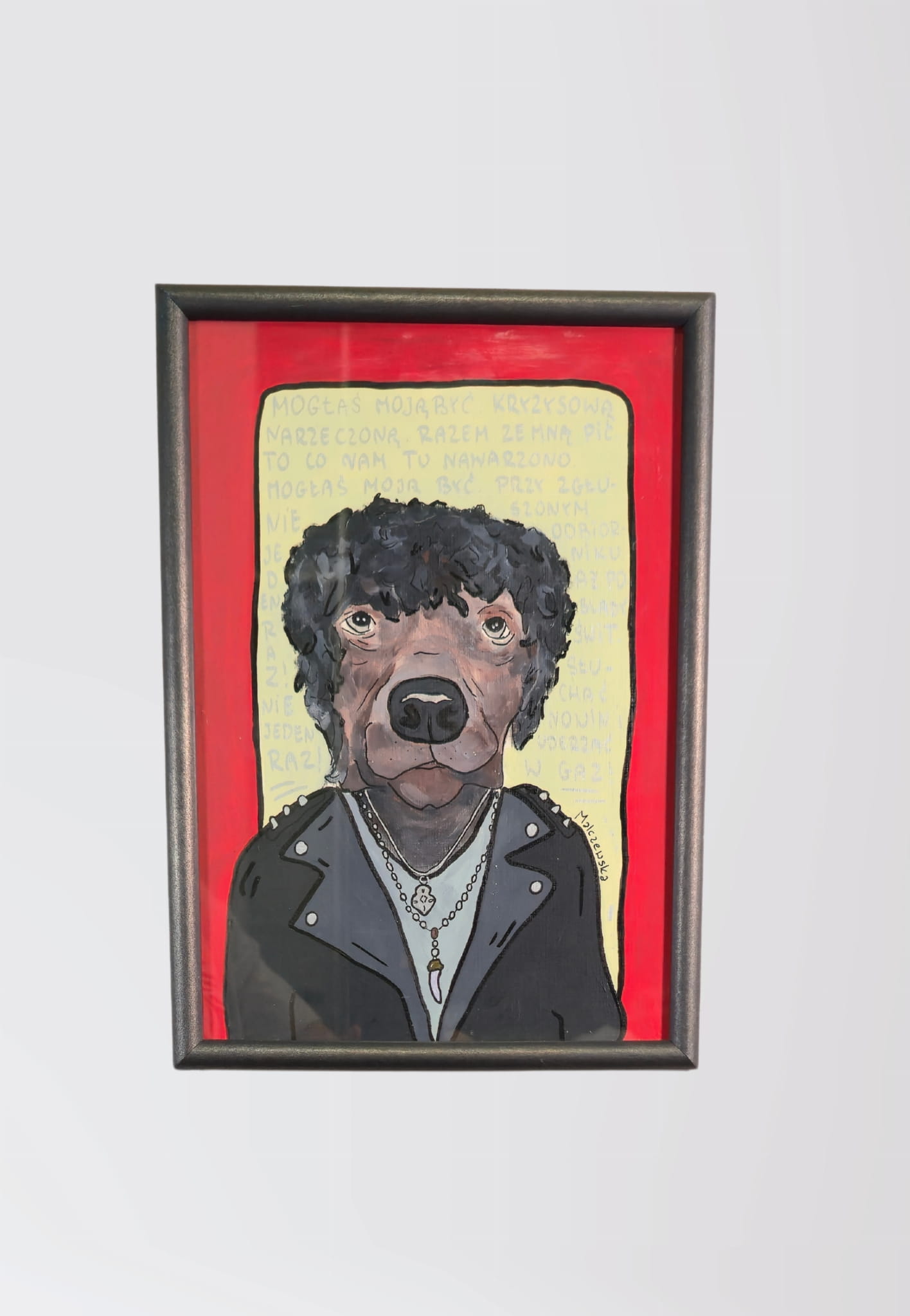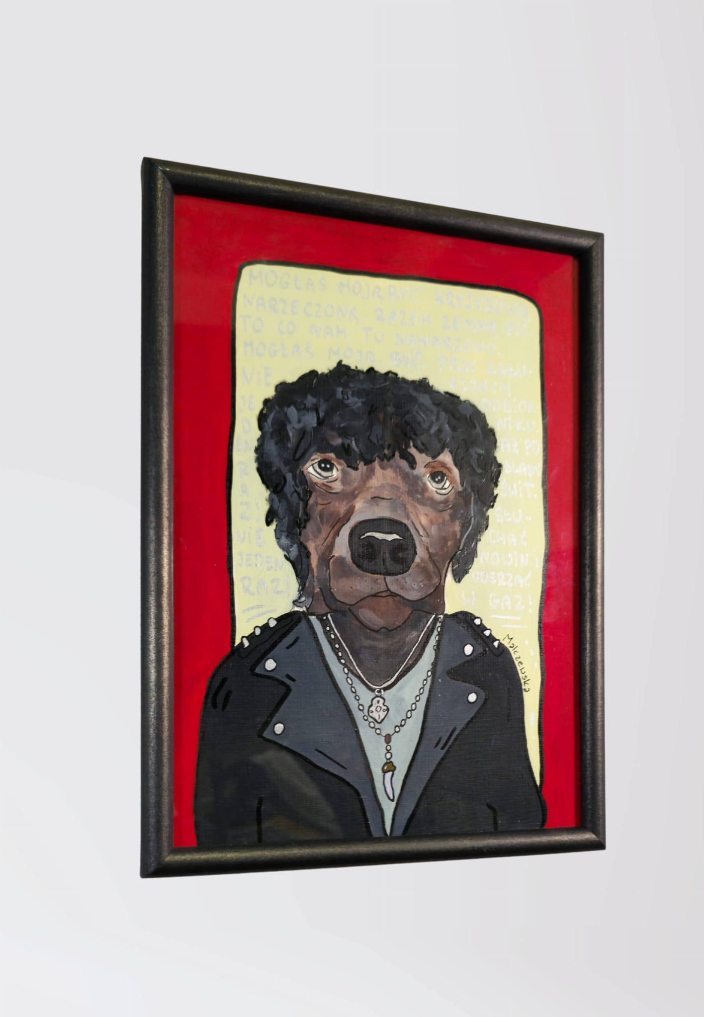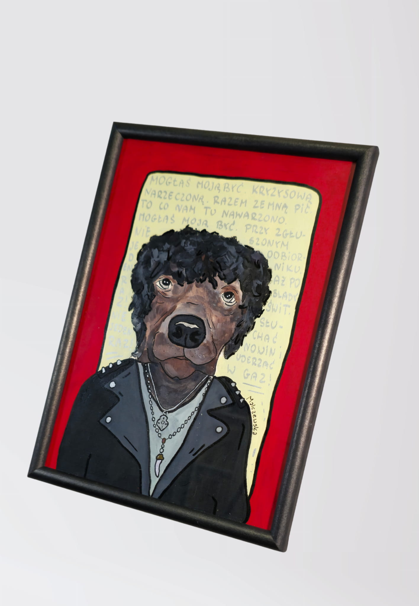 Ręcznie malowana grafika / plakat z wizerunkiem psa stylizowanego na gwiazdę rocka.