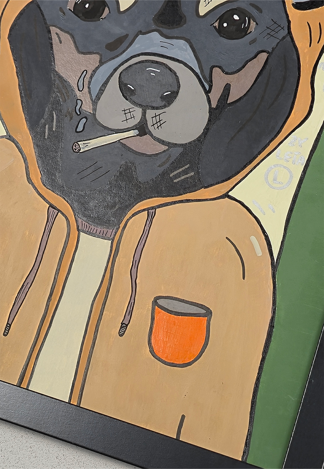 Niech Cię nie zwiedzie jego rozmiar. Ten pinczer / ratlerek ma w sobie więcej „osiedlowej energii” niż niejeden duży pies. Oto "Arek Doręczyciel" – typ, który zawsze „coś ogarnia”. Bluza z kapturem, pewny wzrok i lekki cwaniacki vibe. Trochę kibic, trochę uliczny chłopak, trochę… taki, co „wie gdzie zapukać”