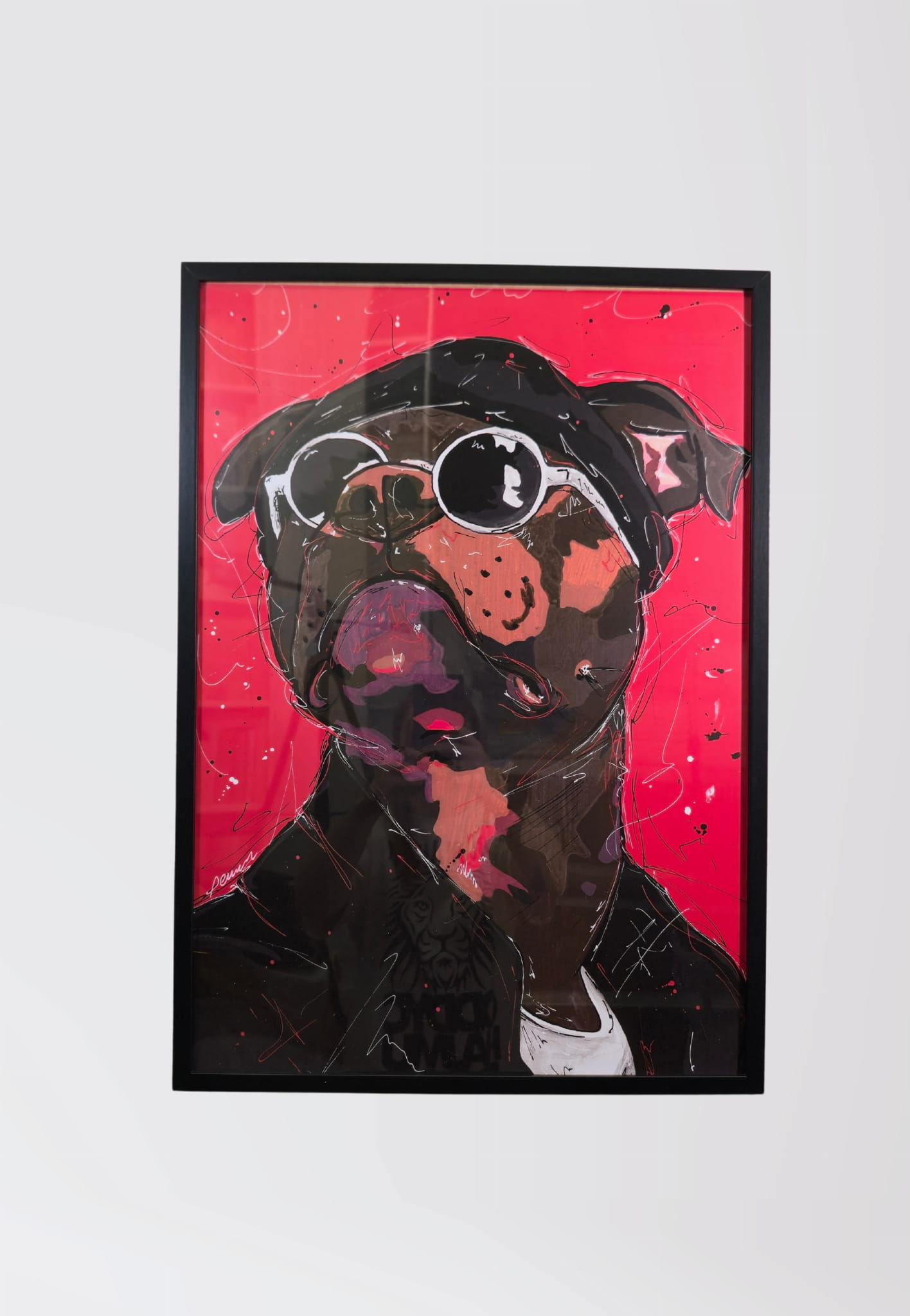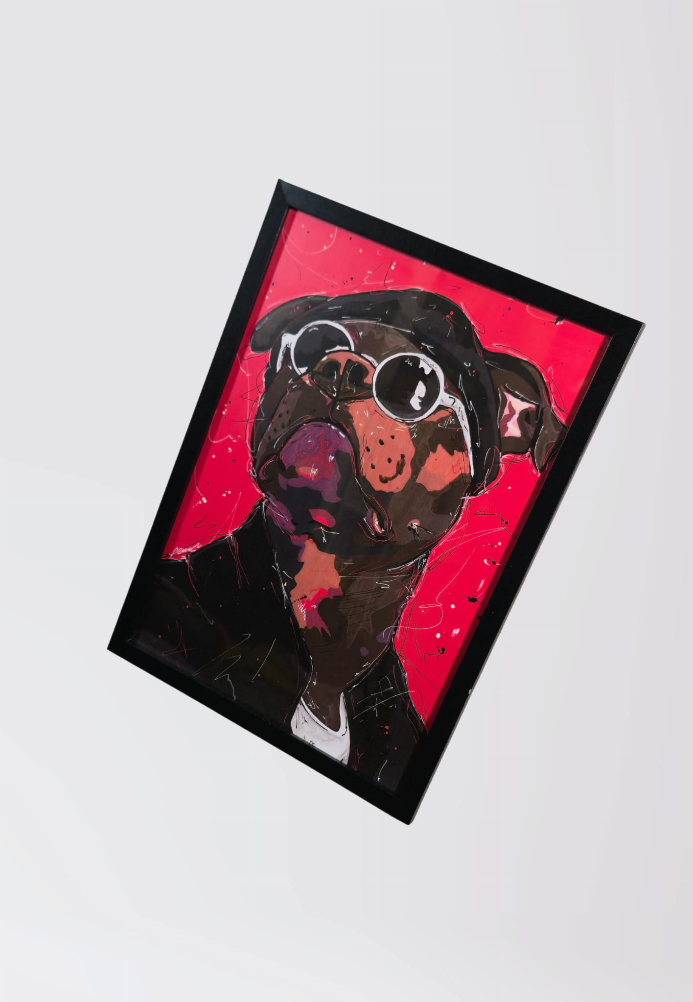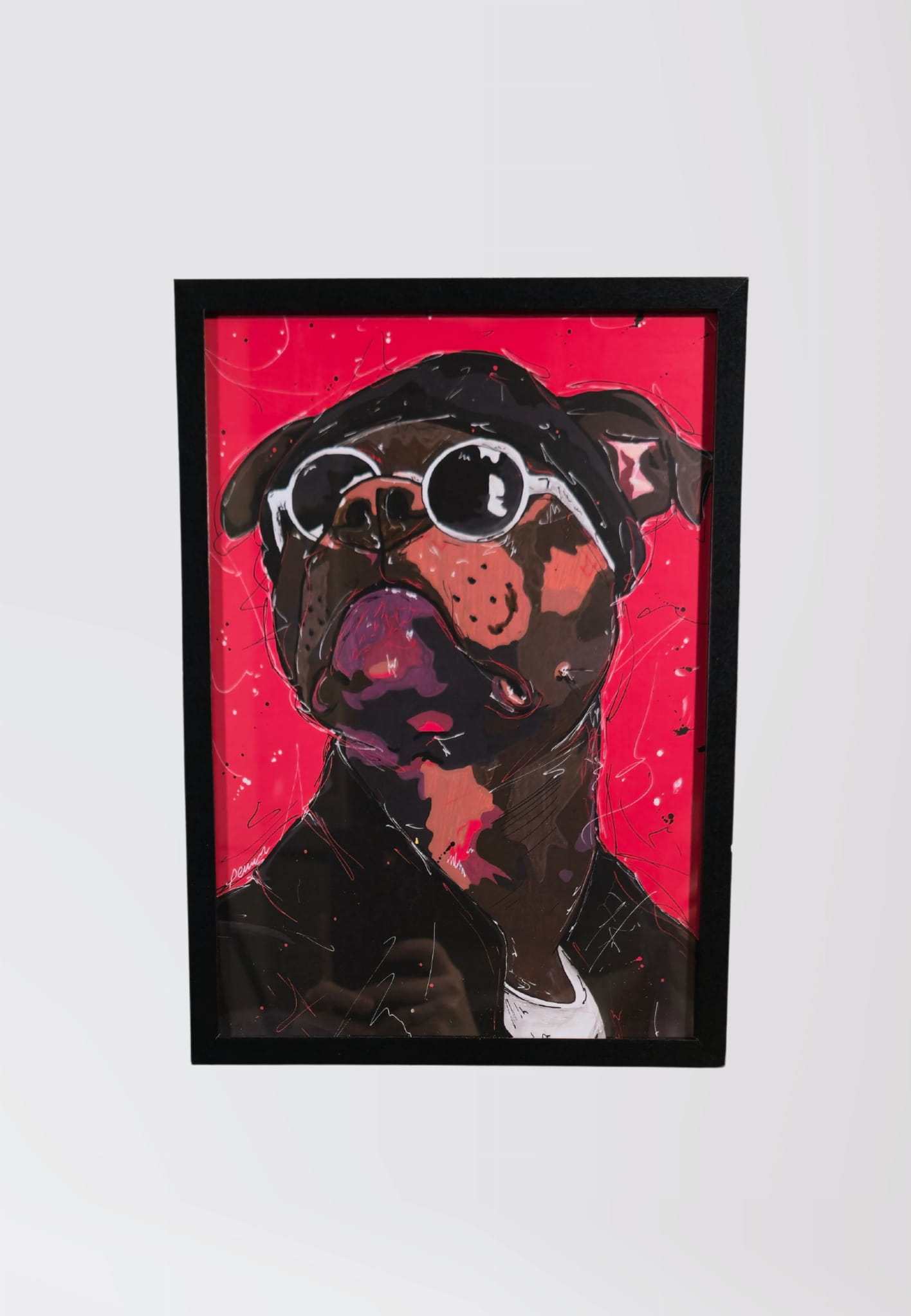 Plakat w ramie z psem w stylizacji inspirowanej filmem LEON ZAWODOWIEC.