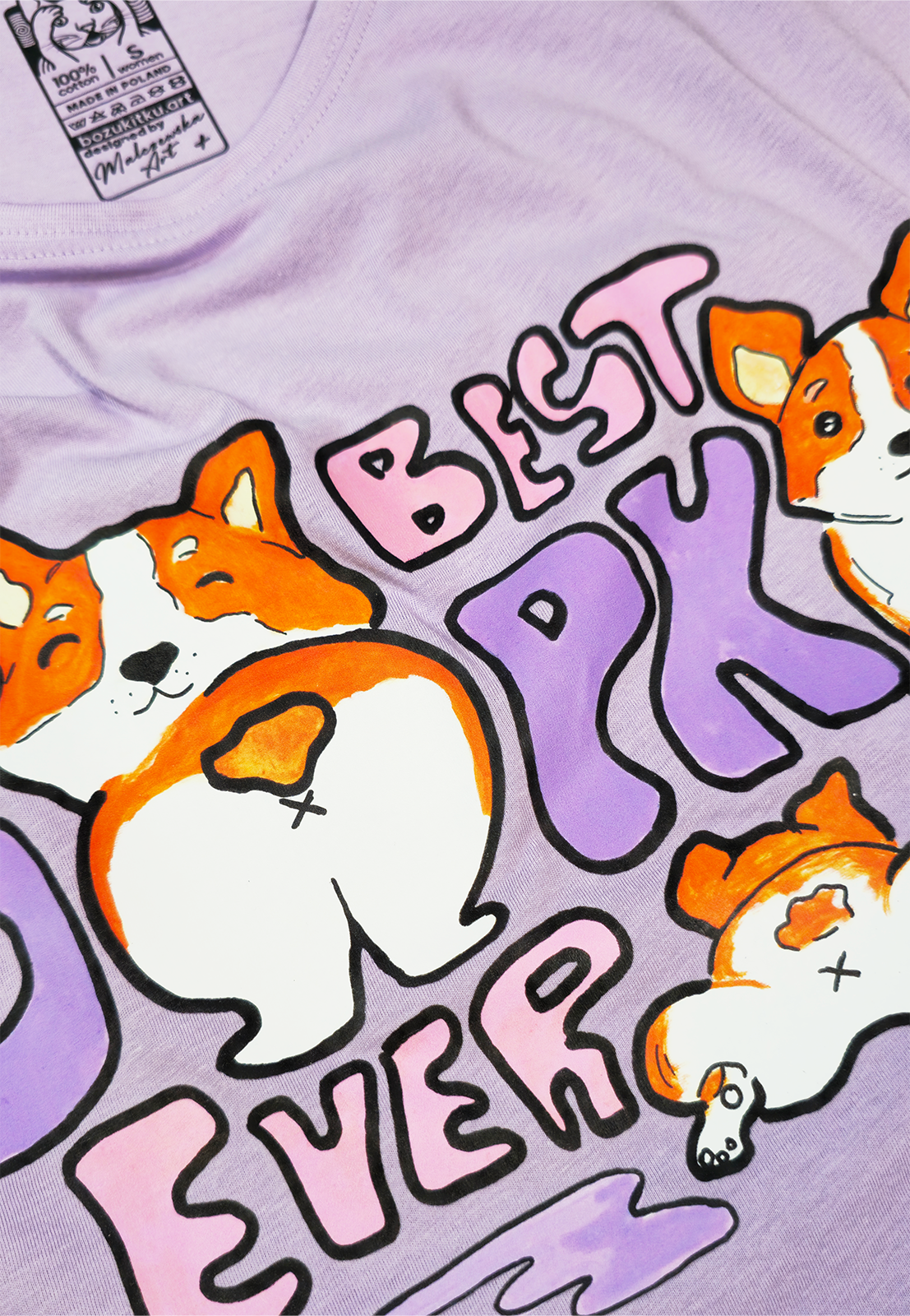 Lekki, bawełniany i uroczy T-shirt z pieskiem rasy Corgi, idealny dla miłośniczek tych uroczych psiaków. Projekt „BEST DOOPKA EVER” to reprint ręcznie malowanej grafiki autorstwa MalczewskaArt, który w zabawny sposób celebruje charakterystyczną cechę corgi – ich słynną „doopkę”.