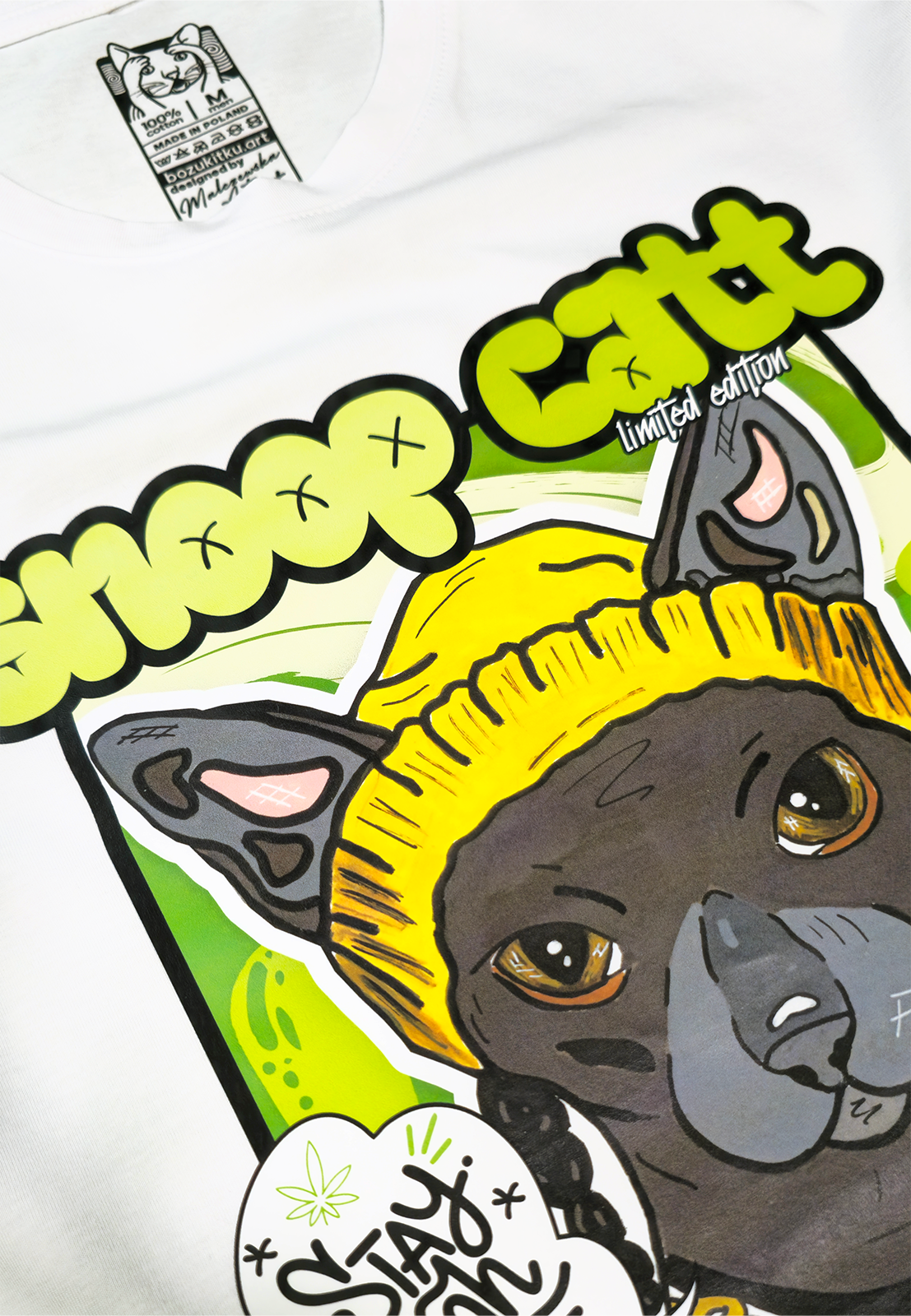 Projekt „SNOOP CAT” to reprint ręcznie malowanej grafiki autorstwa MalczewskaArt. Jeśli kiedykolwiek marzyłeś o połączeniu kota i legendarnego rapera – oto Twój moment! T-shirt idealny do codziennego chillowania, miejskich stylizacji i pokazywania światu, że Twój swag jest na najwyższym poziomie. Jednym słowem – połączenie wygody i „Purr-fect Flow”.
