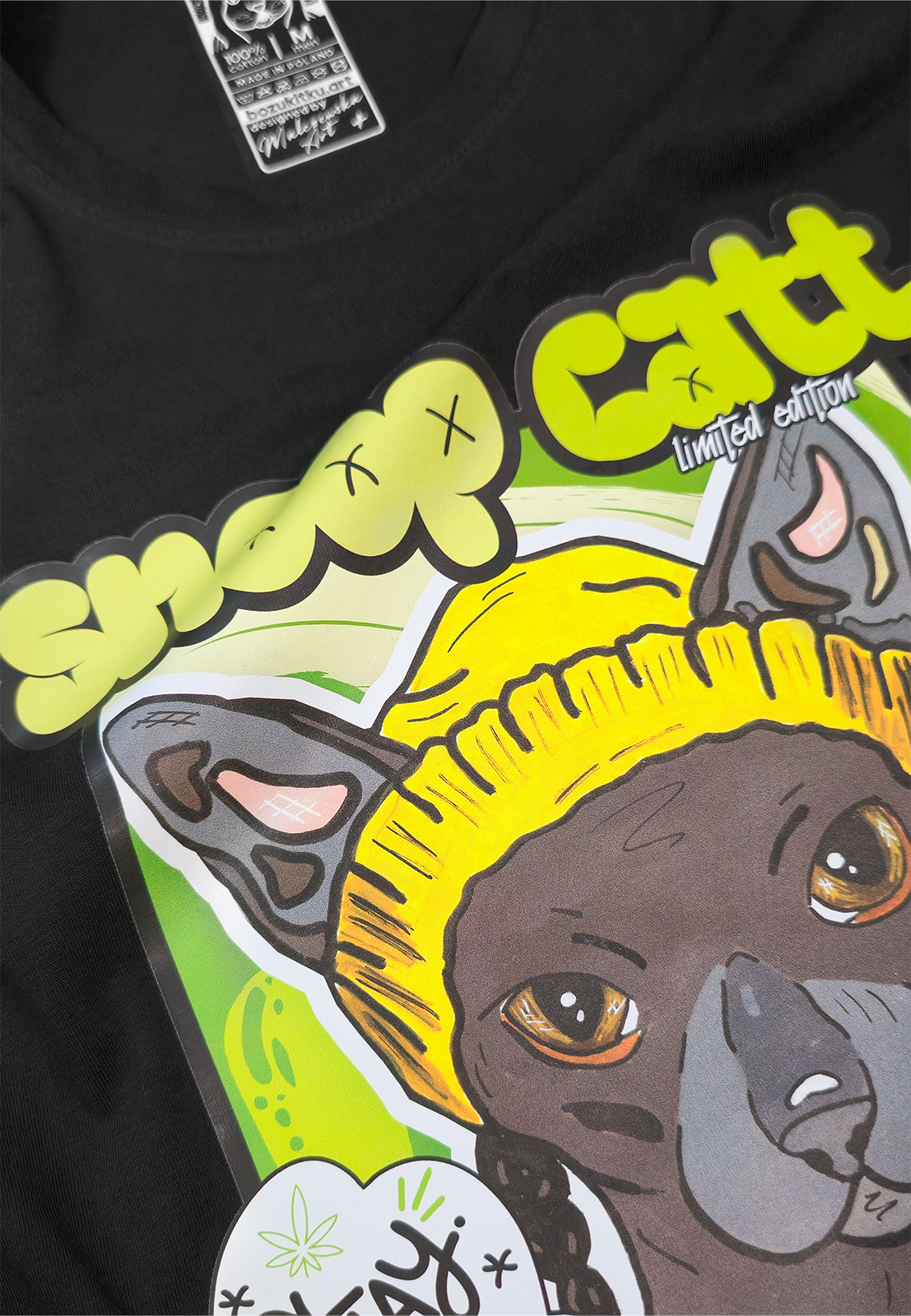 Motyw: Kot Sfinks + Snoop Dog = epicki miks stylu, humoru i miejskiego charakteru; nadruk metodą DTF, trwały i pełen kolorów