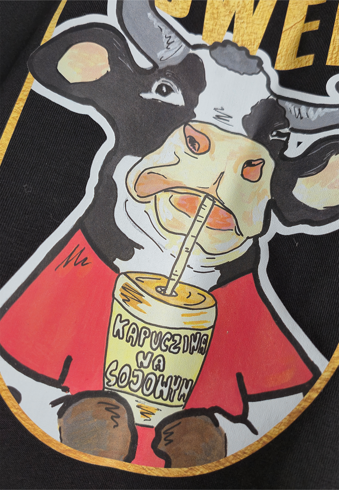 Motyw: KROWA VEGAN REVOLUTION – wyrazisty nadruk bazujący na ręcznie malowanej grafice