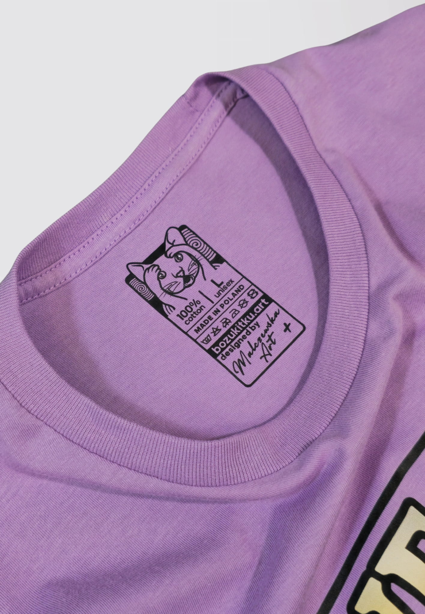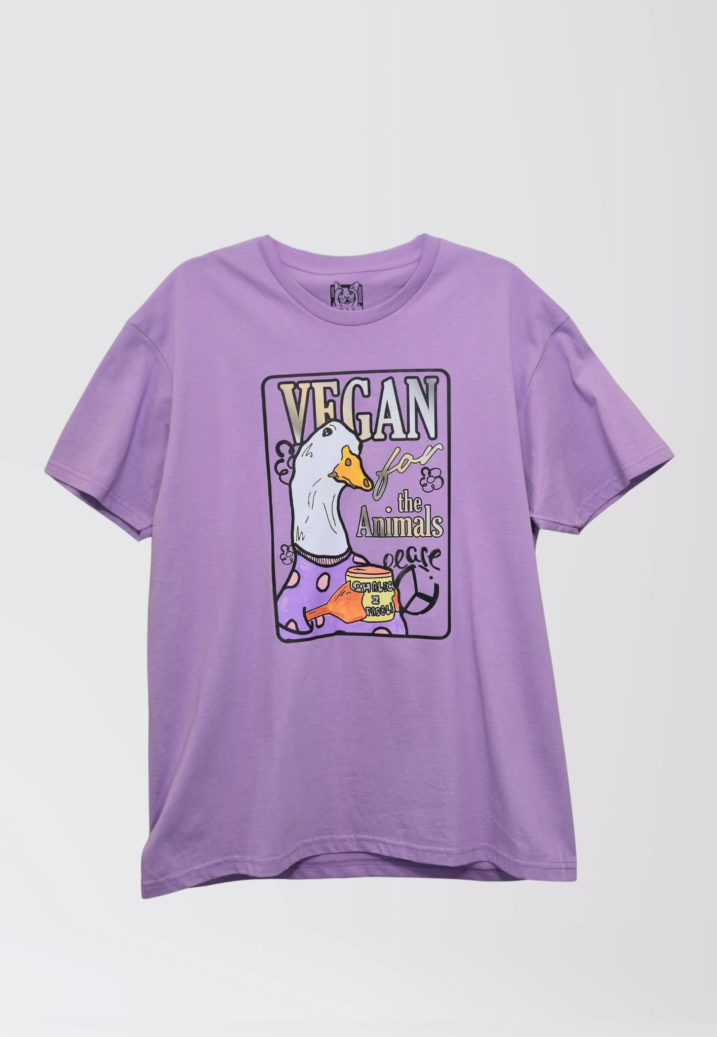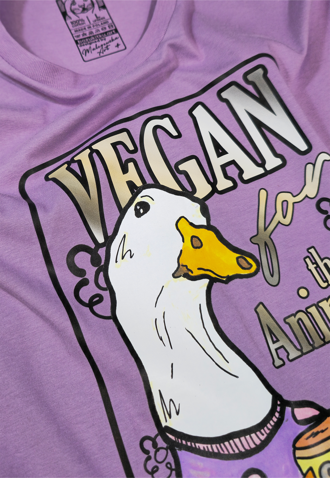 Piękny liliowy T-shirt z wegańskim hasłem VEGAN FOR THE ANIMALS i ilustracją Fasolowej Gęsi. Projekt „SMALEC Z FASOLI” to reprint ręcznie malowanej grafiki autorstwa MalczewskaArt, który idealnie łączy humor, styl i wyrazisty motyw wegański.