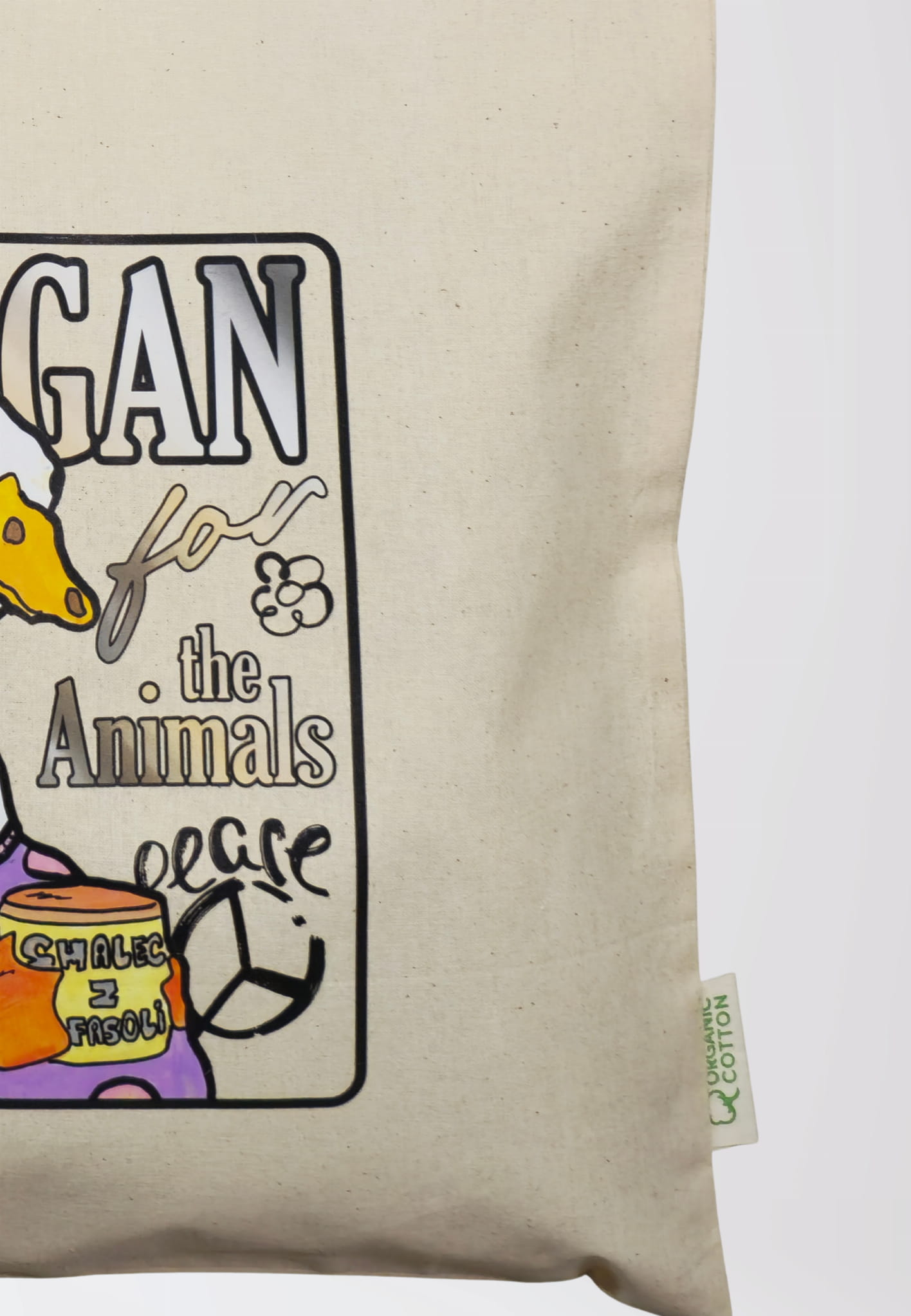 Nasza gęś zamiast moczyć skrzydła w stawie, postanowiła głosić swój VEGAN-manifest! Motyw „Smalec z fasoli” to reprint ręcznie malowanej grafiki, który pokocha każdy weganin i fan nietuzinkowych akcentów w stylizacji.